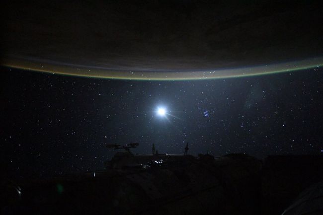 Tuesday, July 10, 2019: The moon lights up the star-filled night sky as an effect called “airglow” gives Earth’s atmosphere a subtle green glow in this photo taken by an astronaut at the International Space Station. This green luminescence is the result of interactions between atmospheric particles and ultraviolet radiation coming from the sun. — Hanneke Weitering